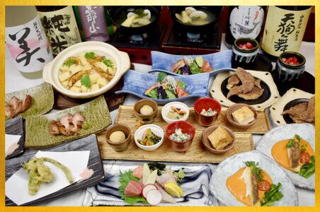 前菜6種 / 焼きシーザーサラダ / お造り6種 / 幻の手羽先 / 陶板料理 / ふぐ唐揚げ / 大海老原始焼 / 飛騨牛ステーキ / 季節の土鍋御飯 / つつみ雪