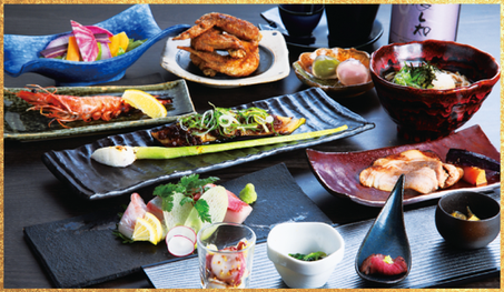 看板商品の「幻の手羽先」をはじめ、手作りのおばんざい、彩り豊かなこだわりの野菜、市場直送の鮮魚お造りなど、旬の食材をふんだんに使用した料理をお楽しみ頂けます。メインは「愛知みかわ豚」。やわらかくジューシーな豚肉の旨味を存分にご堪能下さい。